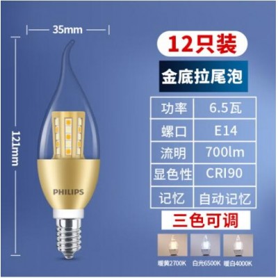 e14螺口led灯泡三色变光超亮蜡烛灯泡拉尾水晶小螺口吊灯家用节能 三色变光【6.5瓦金底拉泡】12只